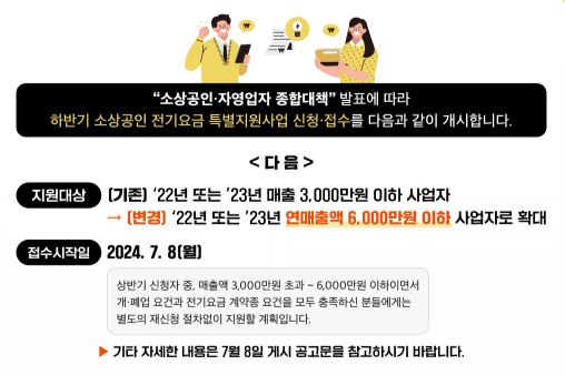 2024년 2월에 연간 매출액 3,000만원 이내만 신청 가능했지만 지원자가 많지 않아 지원대상 기준을 완화했습니다. 7월 8일부터 신청을 받습니다.