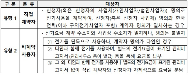 한전과 직접적인 계약관계가 없는 경우로 신청자 정보 입력 및 유형별로 필요한 서류를 제출해야 합니다.