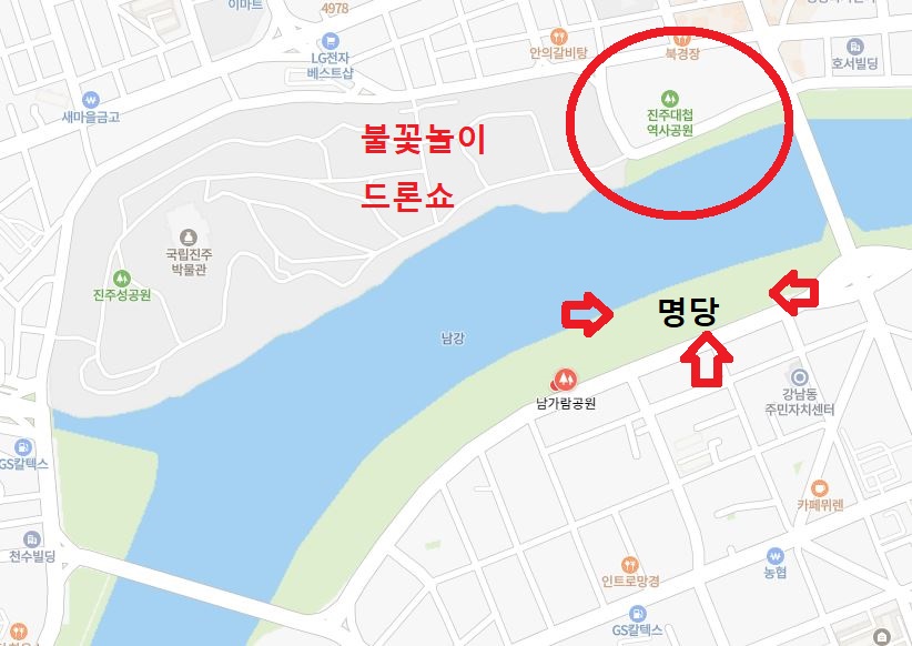 - 남가람공원이 촉석루 맞은편으로 불꽃놀이, 드론쇼 관람하기 좋습니다.