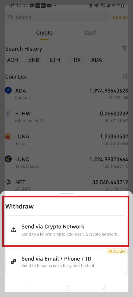 2. Withdrawal - Send via crypto Network 를 선택합니다.