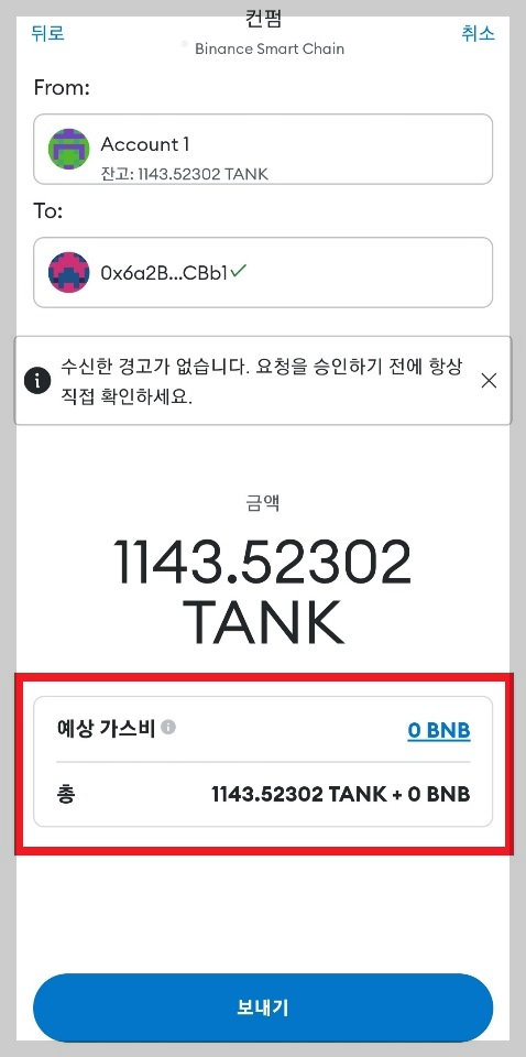 - TANK가 Binance Smart Chain 맞는지 다시 확인하고 보내기 버튼을 눌러줍니다.