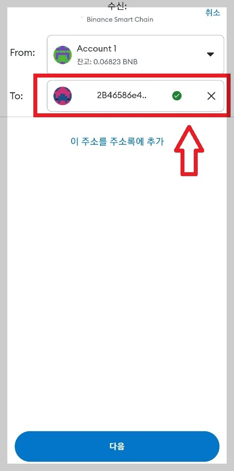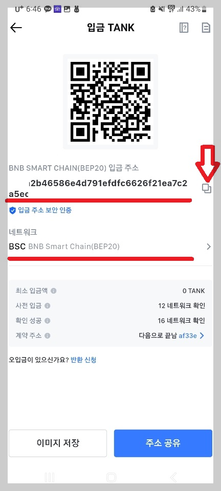 BNB SMART CHAIN(BEP20) 입금 주소를 확인하고 오른쪽 화살표를 꾹 눌러줍니다.(복사)