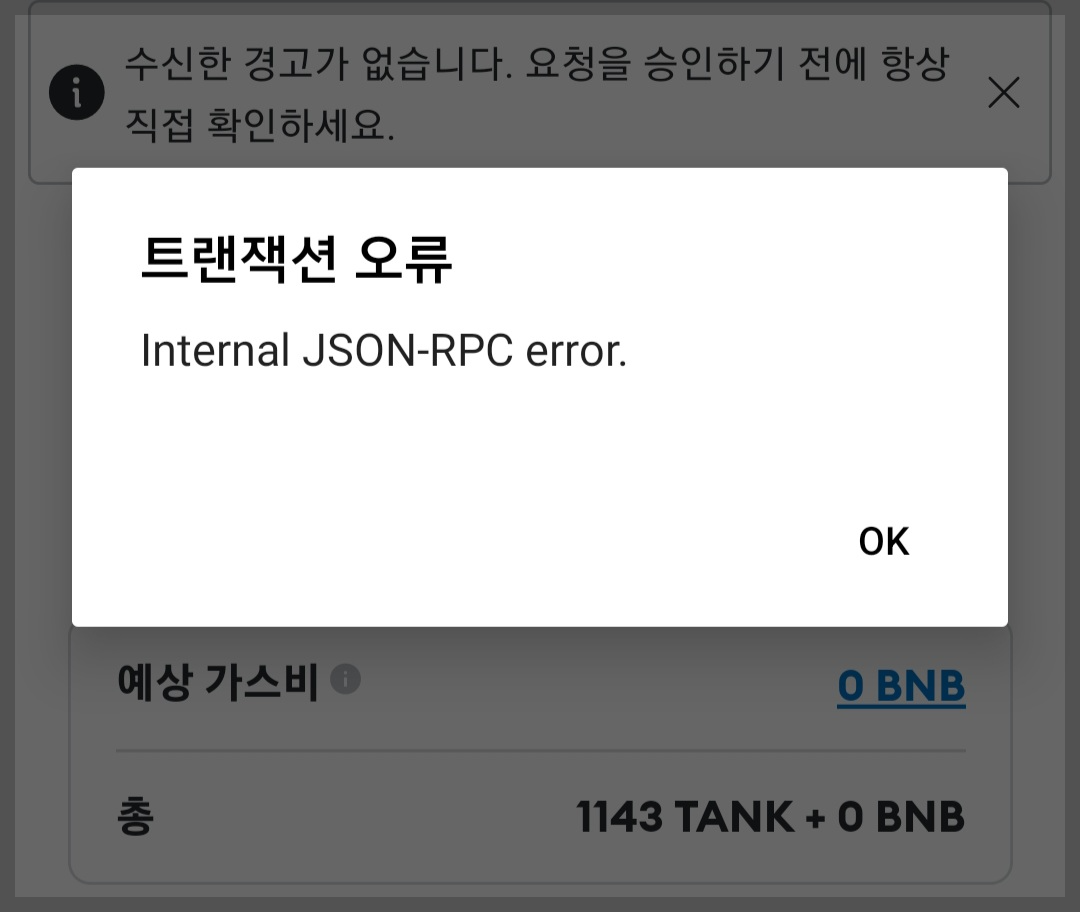 오류 내용은 '트랜잭션 오류 Internal JSON-RPC error. 이었습니다.